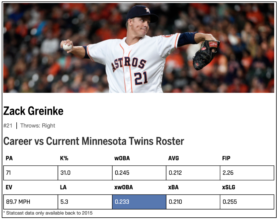 Just as is the case with Astros lineup against Kenta Maeda, the Twins lineup has very little experience against Zack Greinke. In total, this Twins roster has just 65 career plate appearances against Greinke, with most of those coming from Alex Avila and Nelson Cruz. In total, the Twins hitters have combined for a .569 OPS against Greinke throughout their careers.