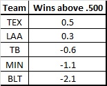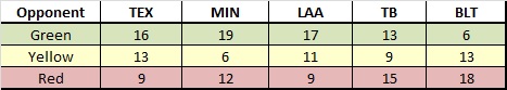 Basically, the Twins record is about one loss tougher than average, while Texas record is about a half game easier than average. The Twins, despite having the most games against the “green” teams, have the second hardest schedule ahead of them.