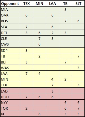 The Twins face a dichotomy. One the one hand, they have a few more tough games than the Rangers or Angels. On the other hand, they have the most of any contender versus the “below .500” category. So it that a good schedule or a bad schedule?
