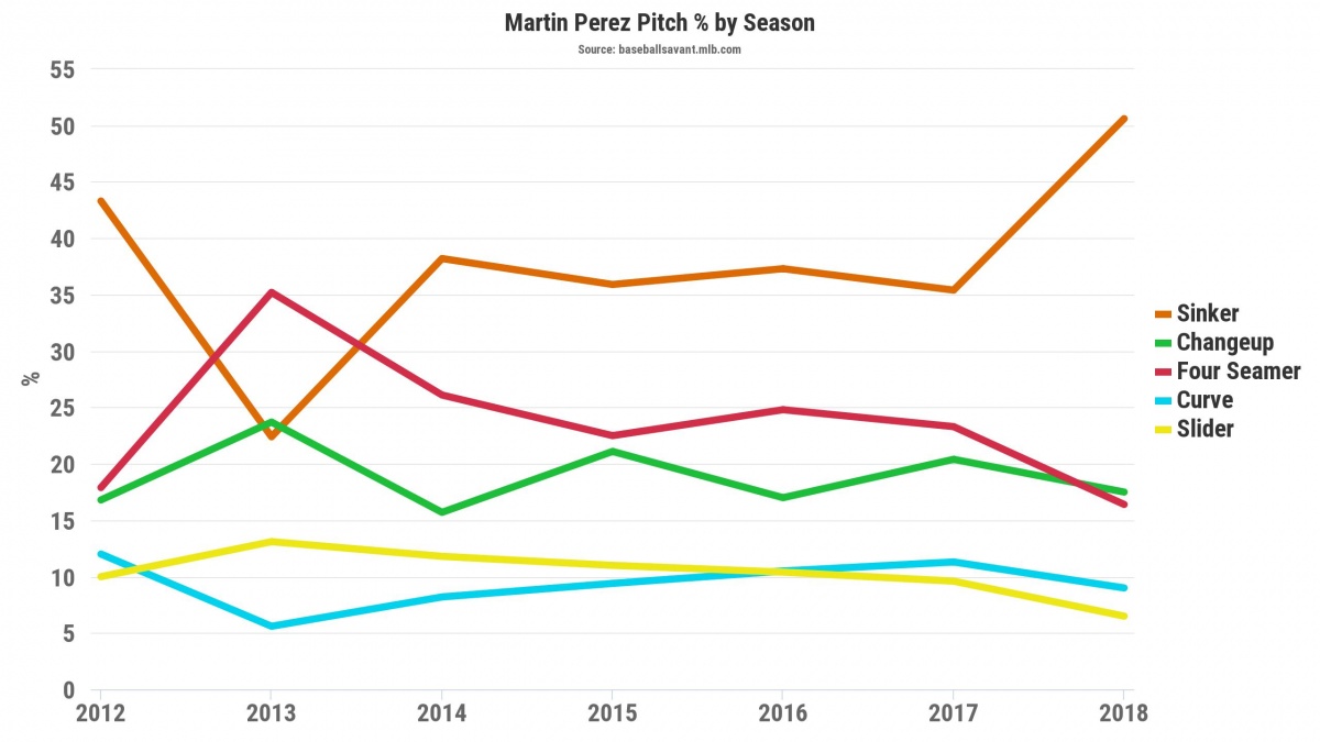 Taking a look at Perez's pitch usages over his career, it doesn't appear anybody with the Rangers ever really pressed him to tinker around. The biggest difference you see is that he threw his sinker more last year.