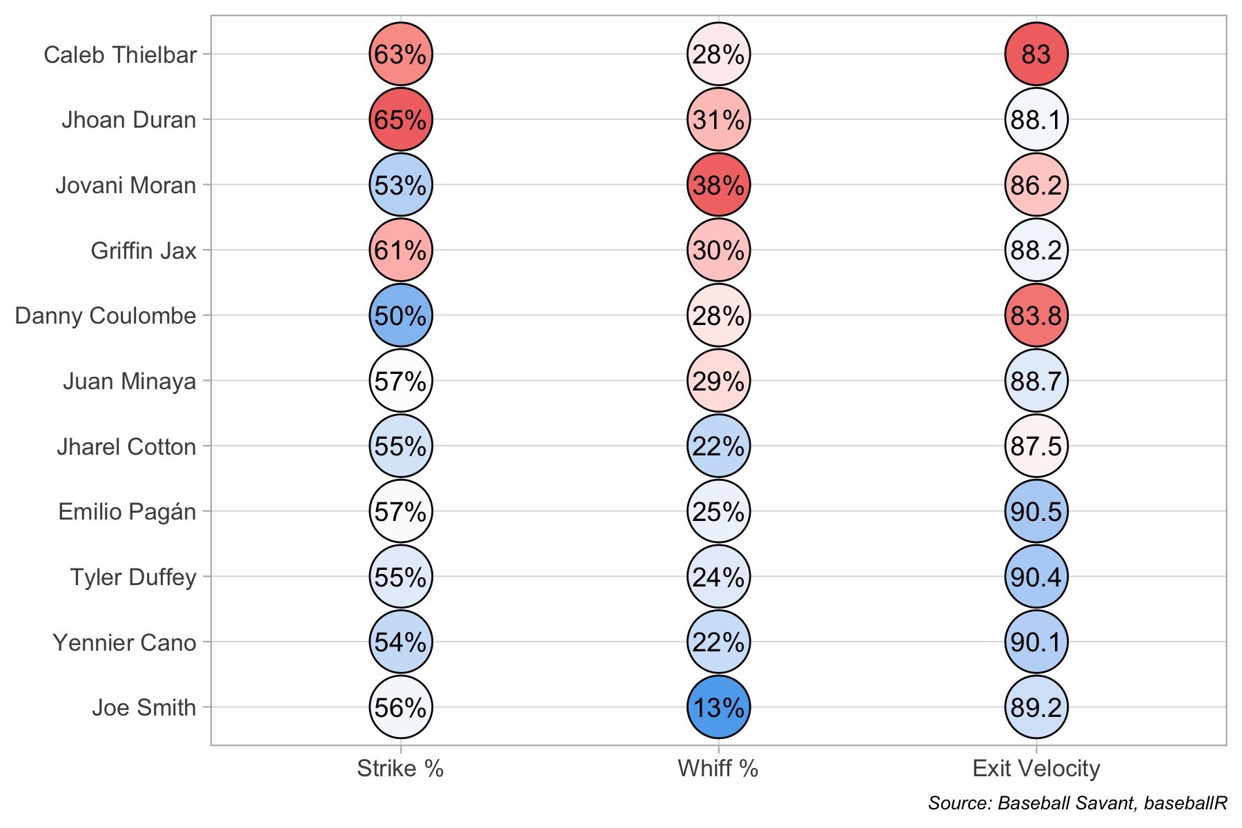 The chart above lists the current options in the Twins bullpen ranked from top to bottom by their measures in three underlying statistics: strike percentage, whiff rate (the fraction of swings that are misses), and average exit velocity. Red circles are good, blue circles are not so good.
