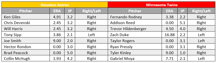 Up until the game on Saturday against the Mariners, the Twins bullpen was off to a good start to the season. Though after giving up six runs over 4.1 innings in that game against the Mariners the bullpen ERA has risen to 4.01. They will need to have a good series against the Astros if the Twins have aspirations of winning this series. It is hard to forget about what happened to the Twins bullpen the last time Houston came to town.