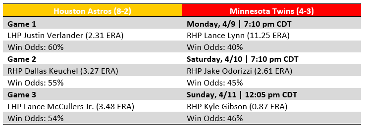 The Twins have looked strong to start the season, after taking the opening series in Baltimore, they have split a series with both Pittsburgh and Seattle. The key for them in this series is to at least take one of three from the Astros to stay at .500 going into a four-game series against the White Sox this weekend.
