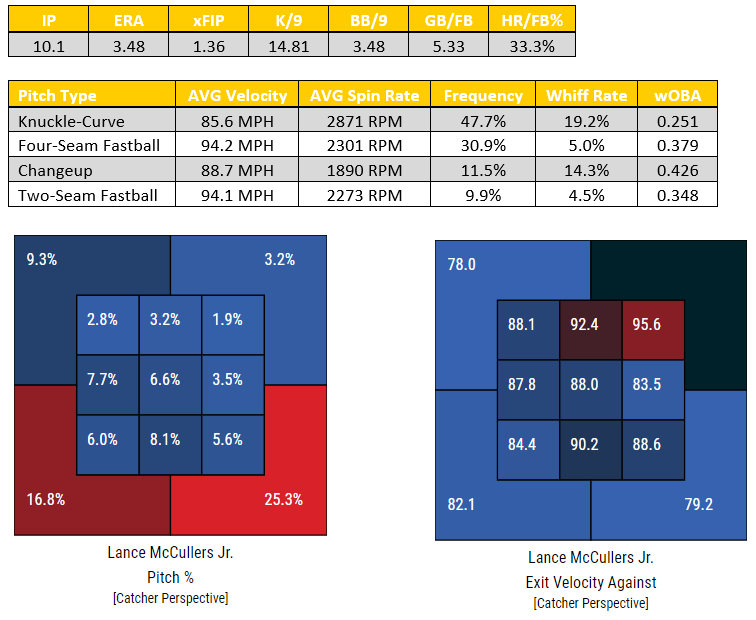 In 2017, there were 280 pitchers who threw at least 1,000 pitches at the major league level, and not a single one threw a curveball on a higher percentage of their pitches than did Lance McCullers Jr. When Paul Molitor is setting the lineup against McCullers, he will need to be wary of McCullers’ pretty stark reverse splits. In his career, McCullers had allowed a .329 wOBA against right-handed hitters, while just a .278 wOBA against left-handed hitters.