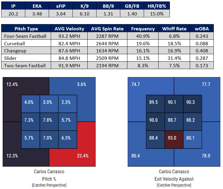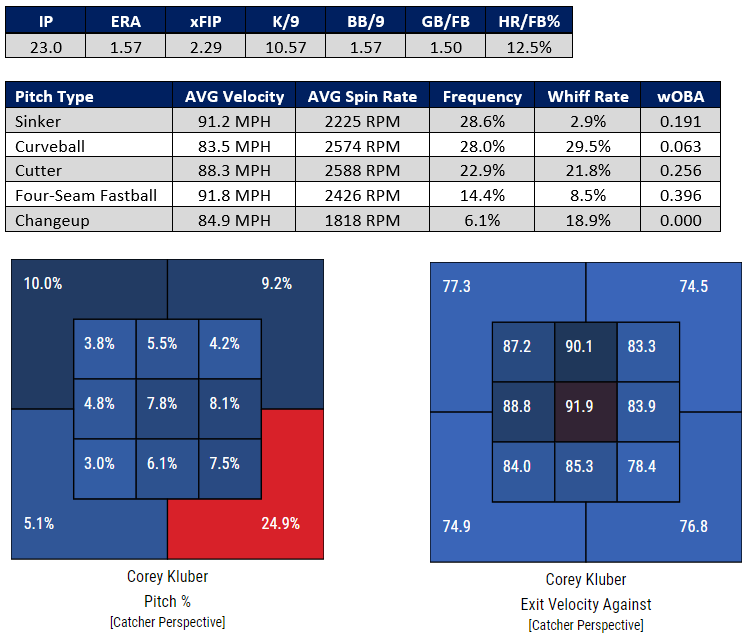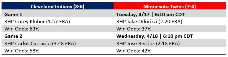 Corey Kluber has established him self as one of baseball's premier pitchers. Over the last four seasons, Kluber has won two AL Cy Young awards and finished in the top-10 in Cy Young voting in the two years he didn’t win the award. Kluber’s curveball is regarded by many as perhaps the best pitch in baseball. Last year, Kluber allowed a staggeringly low .111 wOBA on his curveball and has been even better so far this season. Kluber was dominant in his lone start against the Twins in 2017, where he struck out 13 over seven innings, and allowed just two runs (both unearned). However, the Twins were fortunate enough to escape that matchup with a 4-2 victory.