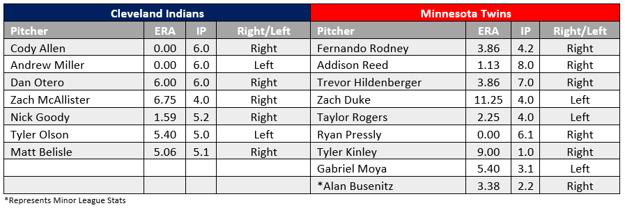 Much like the Twins, the Indians felt the effects of the snowstorm over the weekend, as each of the last two games in their series against Toronto were postponed. This is unfortunate news for the Twins, as Corey Kluber was originally scheduled to pitch on Saturday, but has been pushed back to start Tuesday night against the Twins. The Indians bats still haven’t gotten going yet this year, as they have a mere .200 batting average as a team, and currently have league worst 68 wRC+ through the first few weeks of the season.