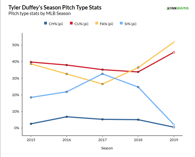There was definitely something off or something to be changed with what Duffey was doing before this season, and the first place to look is his pitch usage. Things were simplified to throwing his curveball 52% and his fastball 46% of the time. This FanGraphs pitch types graph shows the change well.