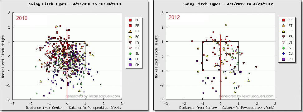 Compare these two swing charts. In his first stint at the major league level (on the left), the Valencia scouting report was not completely disseminated and, as such, he received a high portion of inside and middle of the zone type pitches. In 2012 (on the right), the word has spread throughout the league and opponents know that Valencia is susceptible when being pitched away – specifically from right-handed pitchers.