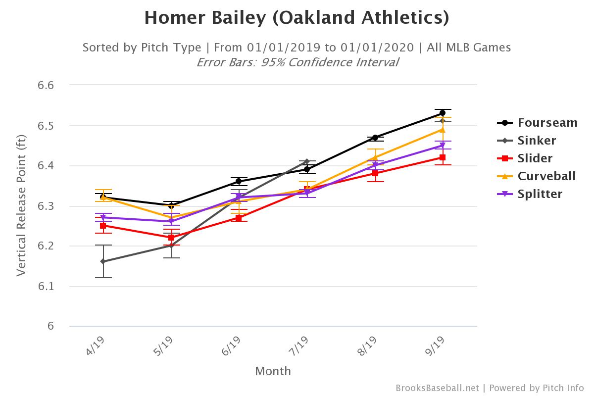 The slide on the rubber and the change of arm angle are good signs that what Bailey did for the A’s down the stretch is partially sustainable. However, after running a very slight reverse platoon split in Kansas City, Bailey fell victim to a severe and scary one in Oakland: