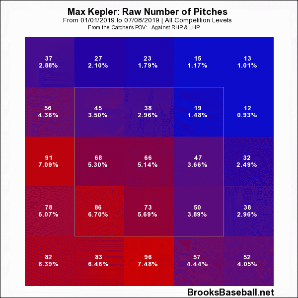 It also opened up some holes in Kepler’s swing. He struggled with pitches at the top of the zone, and even with pitches in the lower, inner segment of the zone. By becoming selective enough to look for pitches on which he could extend his increasingly violent swing and slam the ball out of the park, Kepler made himself vulnerable on high and inside stuff.