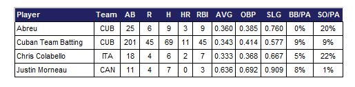 The next best option for comparison is this spring’s 2013 World Baseball Classic. Abreu did manage to hit .360 (9-for-25) with three home runs and nine RBIs. Those sound like decent numbers, until you compare them to the average performer at the WBC. The batting average of qualified players in the WBC was .374. That is, the average player hit .374 (368 for 984). The average player was .014 better than Abreu. Justin Morneau hit .636 (7 for 11) at the Classic. Michael Saunders hit .727 (8 for 11). Sure you can find other big leaguers who did better or worse than Abreu in the Classic. The batting average is something scouts can overlook as it's reasonable to expect a poor five game stretch. A better indicator for scouts than batting average is often a player's plate discipline and strikeout ratio.