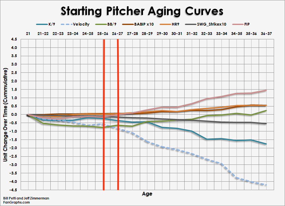The aging curve for starting pitchers in baseball probably looks like what you would expect. Starters come into the league with flaming velocity and a high walk rate, their stats improve as they age until they peak, and then we see a steady statistical decline from that peak until the end of their career. What age does that peak come, though?