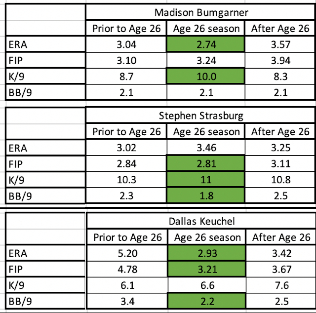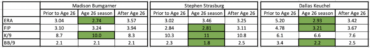 In the graph above I compiled statistics from Madison Bumgarner, Stephen Strasburg and Dallas Keuchel before, during and after their age-26 season to see how they compared. I highlighted in green when their age-26 stats represented a “peak” meaning they improved upon their career stats up until their age-26 season as well as showed a career decline in that statistic following their age-26 season. As you can see, most of these players posted career bests in their age-26 season, supporting our aging curve discussed above to be an accurate depiction of a pitcher’s career.