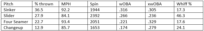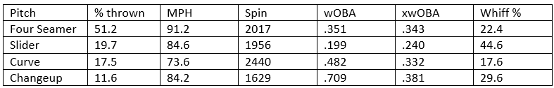 With an underwhelming four seamer, Thorpe is going to need to rely on his secondary pitches if he hopes to succeed as a starter. Thorpe features three secondary pitches (slider, curve, and changeup), but his slider was his only above average pitch. Fortunately, Thorpe’s slider is really good and it gives him a solid floor as a lefty reliever. But to succeed as a starter, Thorpe must find a way to get better results from his other secondary pitches. In an admittedly small sample size, both his curve and changeup (which he mixes in against righties) were crushed. His xwOBA on the curve suggests it might not have been quite so bad and he did get a fair number of whiffs on his changeup, but there’s no denying the numbers were ugly.