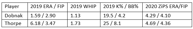 Thorpe was basically the anti-Dobnak in 2019. Thorpe gets a ton of strikeouts but he was also hurt by giving out a lot of free passes. Absurdly, Dobnak gave up only one home run between AAA and MLB (though he did give up six in AA), while Thorpe surrendered 16 dingers in less innings. Thorpe’s FIP greatly outperformed his ERA at both levels and he allowed a .438 BABIP with the Twins, so there is reason to believe his numbers will improve.