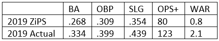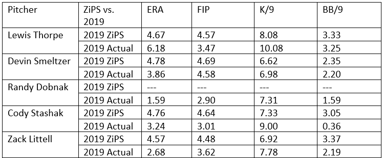 On offense, Luis Arraez is really the only prospect who had enough of a sample size to consider (though LaMonte Wade Jr. held his own in his limited time with the Twins). Arraez’s rookie campaign was obviously a massive success as is evident if we look at his actual results compared to his 2019 ZiPS projections.