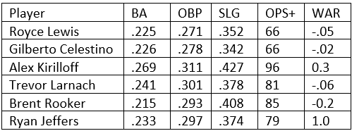 You’ll notice that none of the bats project to be above average and only Alex Kirilloff and Ryan Jeffers are projected as better than replacement level players (Nick Gordon also projects for 0.6 WAR). It makes sense for a projection system to be rather conservative when projecting prospects, as jumping to the big leagues is obviously difficult, and we’ve seen top prospects like Byron Buxton struggle initially upon being called up. However, across MLB we’re seeing more and more young prospects come up and shine. Since Mike Trout and Bryce Harper premiered we’ve seen Ronald Acuna Jr., Juan Soto, Fernando Tatis Jr., Vladimir Guerrero Jr., and Bo Bichette (to name just a few) come up and shine from the get go. It’s not hard to imagine an advanced bat like Kirilloff or Trevor Larnach succeeding immediately at the MLB level.