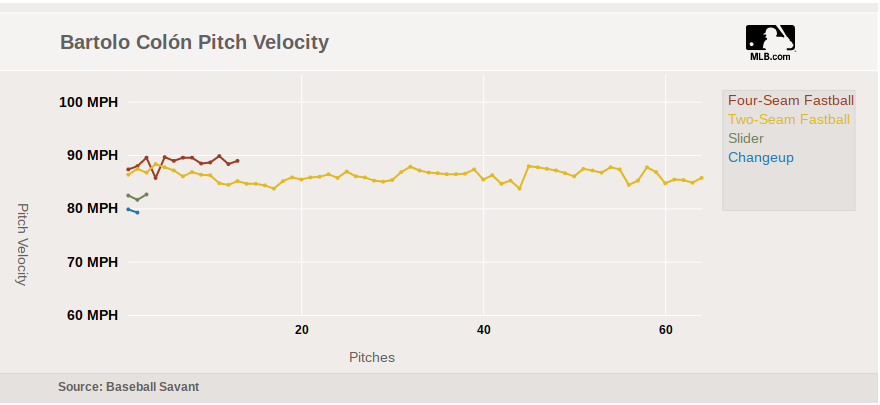 Bartolo did his thing, throwing almost exclusively fastballs that mostly failed to even flirt with 90 mph. You wouldn't expect him to change at this point, right? Info below via Baseball Savant: