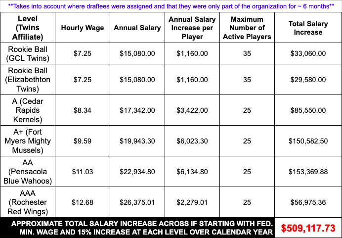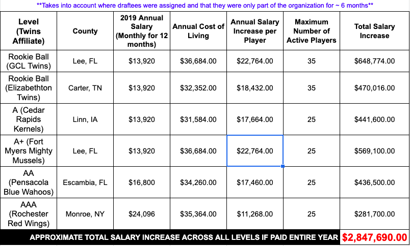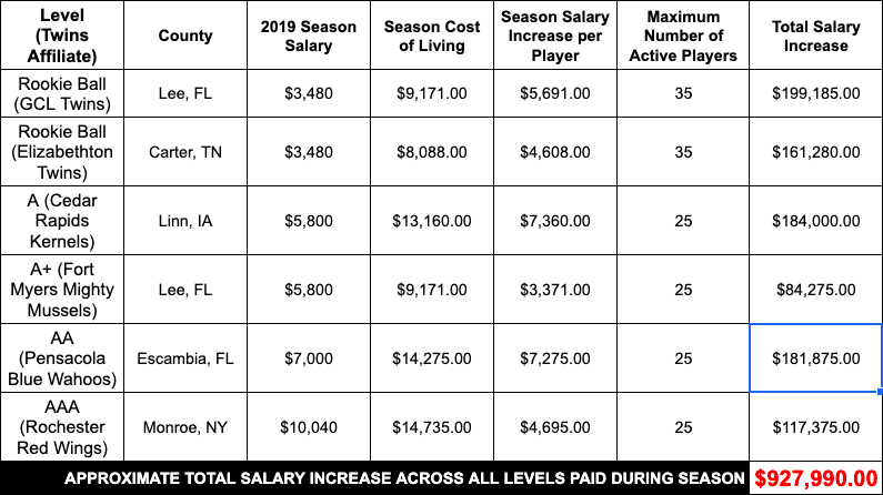 According to Forbes, the Minnesota Twins had a revenue of $269 million in 2019 of which $151 million was dedicated to major league player expenses like salary, benefits, and bonuses. After taking out other expenses, the Twins ended with an operating income of $14 million before interest and taxes were taken out. We don’t know the net income (aka profit) so, working with only the numbers that we know, let's say we are going to pull additional monies from the operating income to increase the pay for minor leaguers.