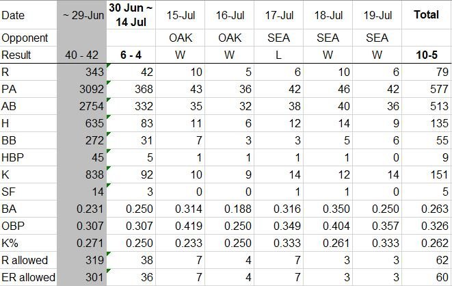 Most of the numbers say that this was not a bad offensive game, consistent with the "season beginning on 30 June." Two numbers, 2 R and 8 team LOB (all in scoring position, no less) deliver the sting of disappointment. It hurts to hit 5 (5!) two-baggers and still lose the game. Batting average, on base percentage and strikeout rate have all improved markedly today and for the eight days since the miserable 82-game first half. Under normal circumstances, we'd be pretty happy going 5-3 (extra-inning loss excepted), but the fact that the club had to climb out of a 2-game-under hole leaves most of us feeling... meh!
