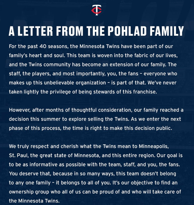I love this news. As it is, the Twins are settling in as one of the also-rans of the American League. Beautiful ballpark, occasional playoff appearances, and no real motivation for a title. I remember when Correa signed here again in 2023, an ESPN commentator said something like, "I don't know why he chose Minnesota. They don't win. He's not going to win anything there." The word is out about this organization. New ownership group might be terrible, making the pathway to a title seem pretty distant. I can't possibly see how that's different from what we're already experiencing. Compared to the league, the Twins are already back to Metrodome-era spending. New ownership - for personal or business reasons - might see a winning Twins team as a priority. That would truly be a game changer.