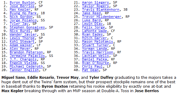 16. I'm beginning to think this is a prime-parody account. Our current "middle of the pack" farm system would like a word. (#2 MLB, #4 ESPN, #4 Bleacher Report, #7 Fangraphs, #3 Baseball America, #16 USA Today lol,) I would say you have a point about the farm in 2015-2016 but being the worst team in all of baseball for years will tend to get you that. I'd say that any idiot could get a great farm with high first round picks but then I looked to see the likes of Levi Micheal, Alex Wimmers, Kohl Stewart, Nick Gordon and Tyler Jay etc. Kind of a "paper tiger" farm system if you will. Being ranked due to draft equity is not great. They earned their firing on the basis of first round picks alone. Farm system rankings being the crapshoot they are, it all comes down to long term results. All-Star games are just about the last possible metric I would use, personally. The mandatory All-Star selection was how many of your list? There are two players in the entire organization that this FO doesn't own completely, they literally threw almost everything in the trash and kept a few choice pieces. Having taken out the trash, we now have an almost entirely homegrown roster that can absolutely compete for championships and 6 top 100 prospects to boot. You never had that in all of Twins history, certainly not under Smith and Ryan. The turnover and turnaround is exceptionally impressive. As for payroll, comparing 2015 money to 2024 money is pretty silly. They have roughly the same payroll levels by all actual metrics. It's easy to be unimpressed if you don't know what to look at. This is a top 5 front office in baseball. Gleemans 2016 prospect list is in a tidy format for a trip down memory lane. Yikes.