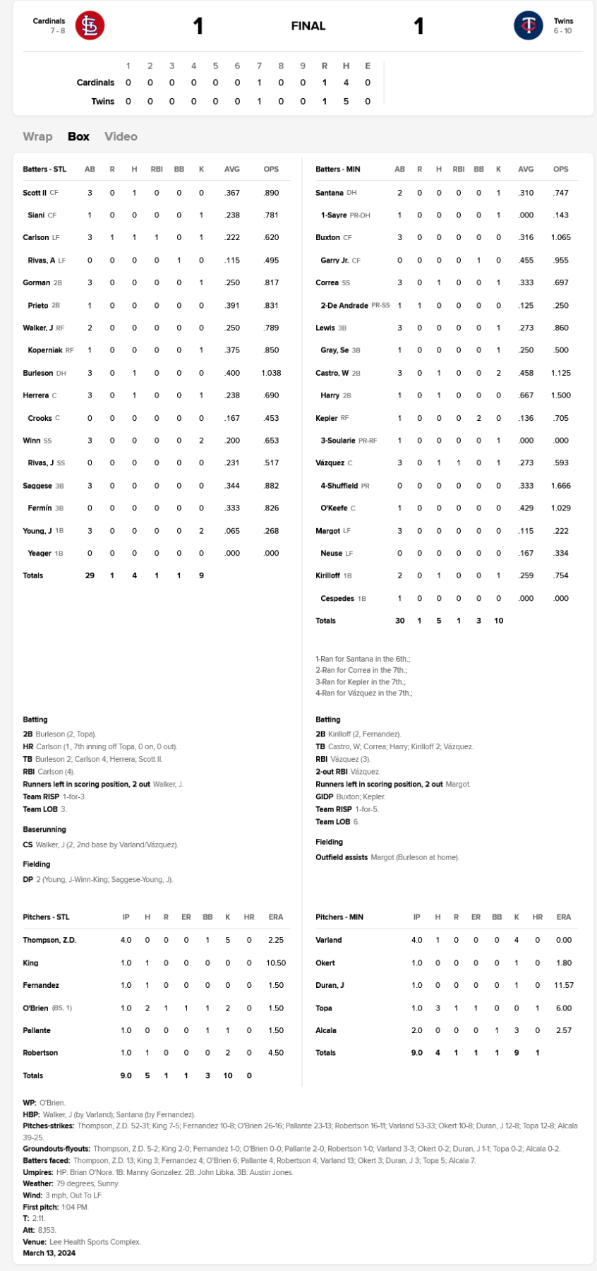 12. If Wallner ends up starting the year in St. Paul, who is the most likely Left Fielder? So far Twins only have 4 hits and Kepler's home run drove in Correa for 2 runs. Duran is getting knocked around.
