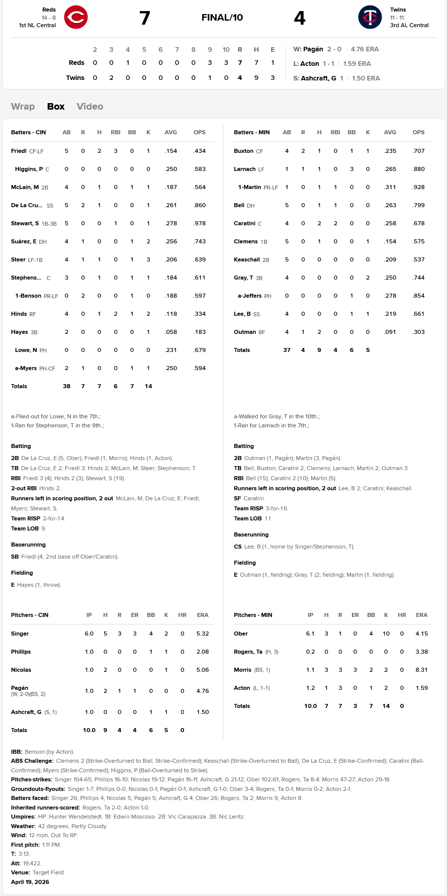 8. Minnesota batters had 5 Ks, the Reds had 14 Ks, and Minnesota still lost. That says a lot.
