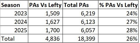 Over the last 3 years the twins have averaged about 26% of their total plate appearances against lefty pitchers. The issue isn't that the roster is too left handed, the issue is that they don't do enough damage against right handers. All the left handers would be fine if they crushed right handed pitching, but that isn't the case.