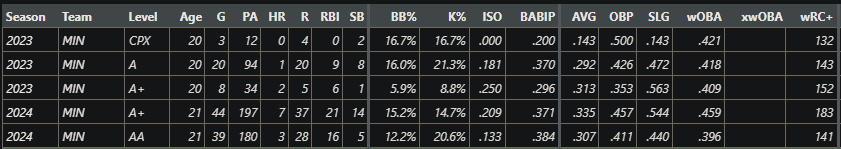 I like Fangraphs' layout better for looking at minor league stats, Keaschall has been incredibly impressive at every level.