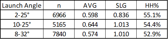 Nice article! I did a bit of a dive yesterday on what the Twins have been doing in the last couple of weeks to improve so drastically on offense, and by the stats it really seems like that answer is as simple as "make better contact." There's very little data to back up a change in hitting philosophy, which as you noted is a strategy that's been around baseball for a very long time - hit hard line drives. Since the Tigers series on 4/19 the biggest differences I see in batted balls are: +7.4 contact % (29th to 6th best) -3.0 whiff % (29th to 17th) +2.8 hard hit % (23rd to 15th) -4.0 ground ball % (26th to 14th) +4.6 fly ball % (18th to 6th) Approach-related changes over that timeframe include: +0.1 swing % -0.8 called strike % -4.4 pull % (OPS is up by 0.412 on pulled hits, +2.6 mph exit velocity & +8.3% hard hit) +2.9 straightaway % (OPS is up by 0.295, +1.6 mph & +6.6% hard hit) +1.5 oppo % (OPS is up by 0.170, but with softer hits by 2.7 mph & 12.5% hard hit -> mostly luck variance) Additionally, they've actually been seeing more offspeed and fewer fastballs over this timeframe: +0.6 zone % -3.9 fastball % (4-seam, sinker, cutter) +1.5 slider % +2.2 changeup % Interesting to see an attempt at equally sized bins for batted balls, and also that the upper bound of your line drive bin matches Statcast's definition on the nose. They go from 10-25 degrees, sweet spot is 8-32 degrees. For reference,