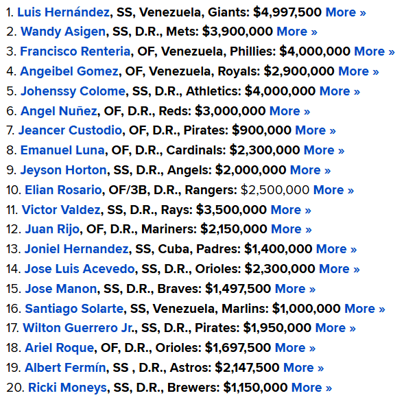 Well so far I count the A's, Reds, Royals, Giants, Rays, Tigers, Angels and Cardinals among teams that gave out +2M contracts. And then if you want to go by prospect ranking, here's the top 20: Any list that has the Pirates on it twice can't have any relevance to competitiveness.- 42 replies