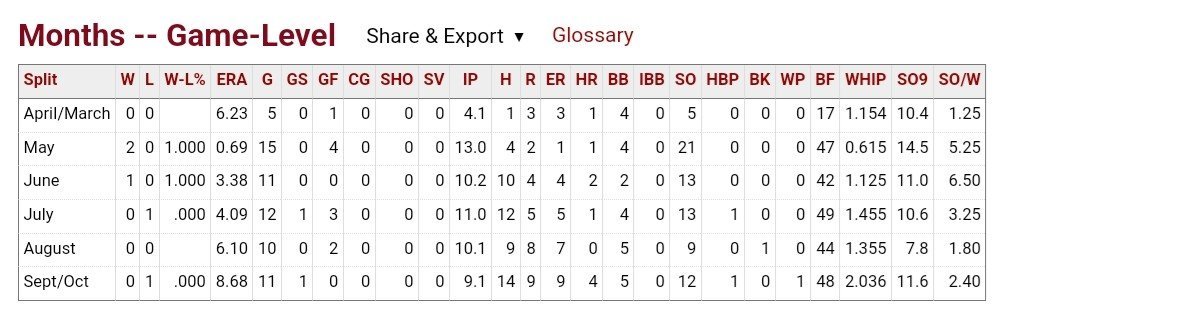 Looks like Okert has been used for between 50 & 60 innings a year. Last year he started out poorly through his first 5 appearances in April, then got hot. He did then decline every month as the season wore on. Does he routinely wear down? Even only pitching less than 60 innings? With the bullpen depth they have they shouldn't have to ride him hard. The strikeouts look good.